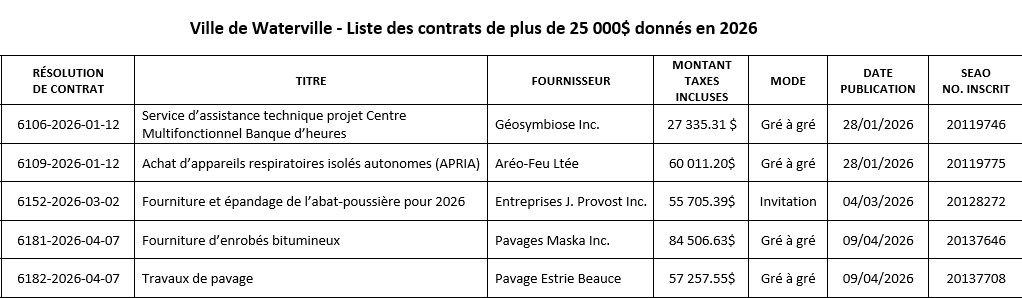Les municipalités sont soumises aux dispositions législatives et réglementaires encadrant l'adjudication de contrats municipaux. La Ville de Waterville travaille de concert avec plusieurs entreprises pour des contrats de tous genres.