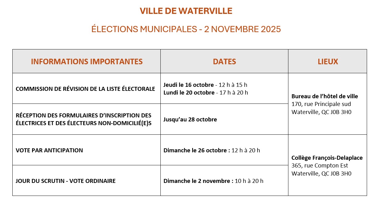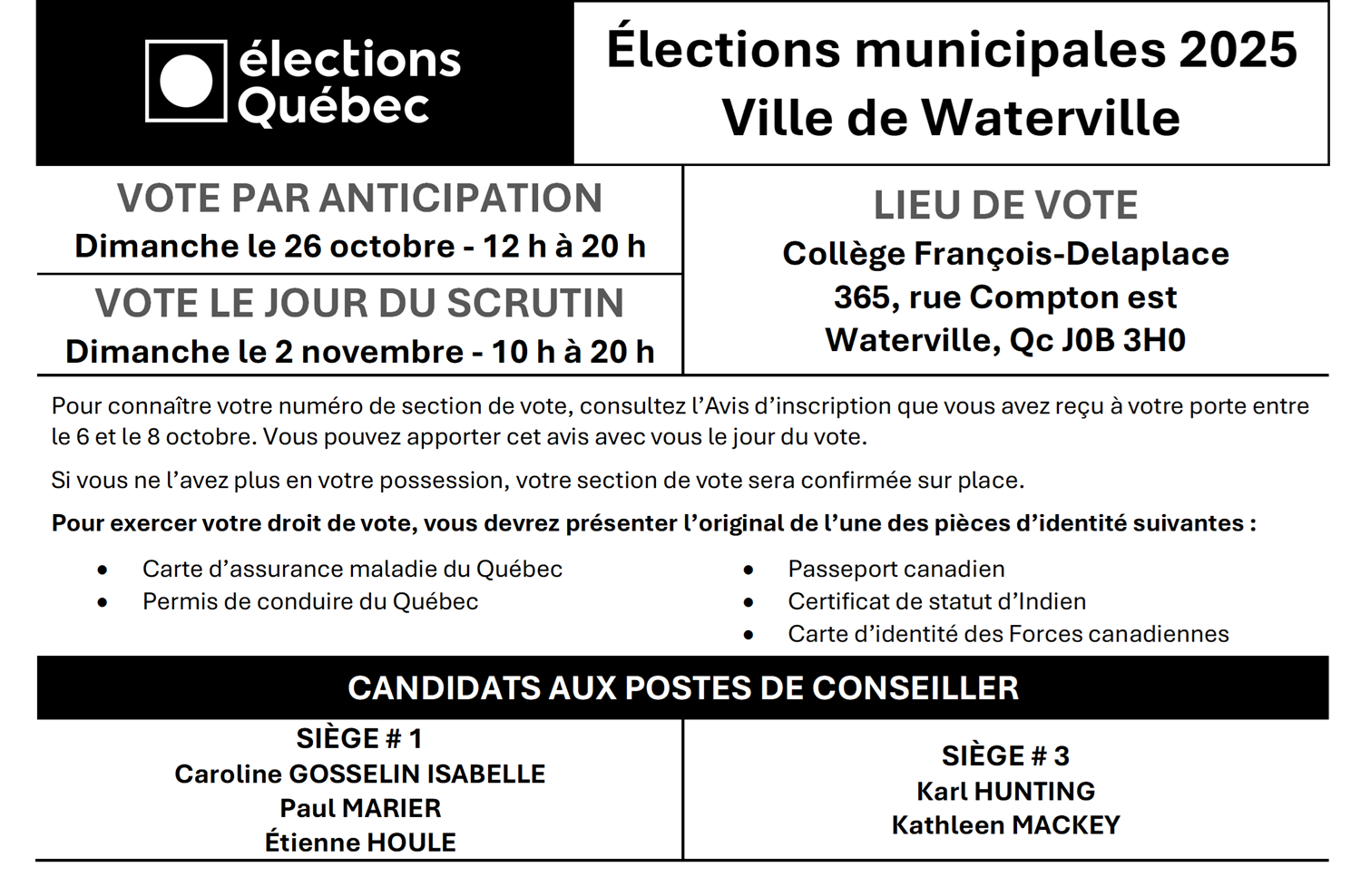 DÉPÔT DE VOTRE CANDIDATURE: En vue de l’élection générale du 2 novembre 2025, vous pouvez déposer votre déclaration de candidature entre le 19 septembre et le 3 octobre 2025 au bureau de la Présidente d'élection au 170, Principale Sud à Waterville.
