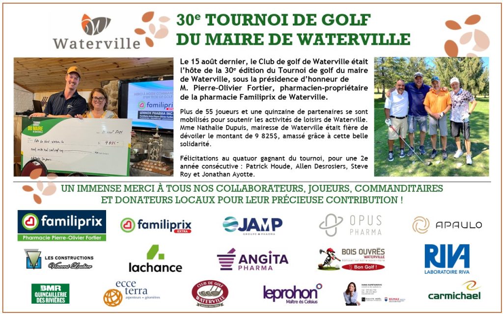 Plus de 55 joueurs et une quinzaine de partenaires se sont mobilisés pour soutenir les activités de loisirs de Waterville. Mme Nathalie Dupuis, mairesse de Waterville était fière de dévoiler le montant de 9 825$, amassé grâce à cette belle solidarité.