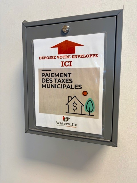 Le paiement peut être fait directement à l’hôtel de ville par Interac (débit seulement), chèque ou argent comptant. En dehors des heures d’ouverture, une boîte murale sécurisée est accessible dans le hall d’entrée. Le courrier est ramassé chaque jour ouvrable.